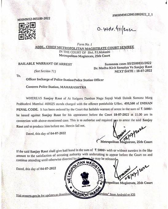 संजय राऊत यांच्याविरुद्ध शिवडी न्यायालयाकडून अटक वॉरंट जारी