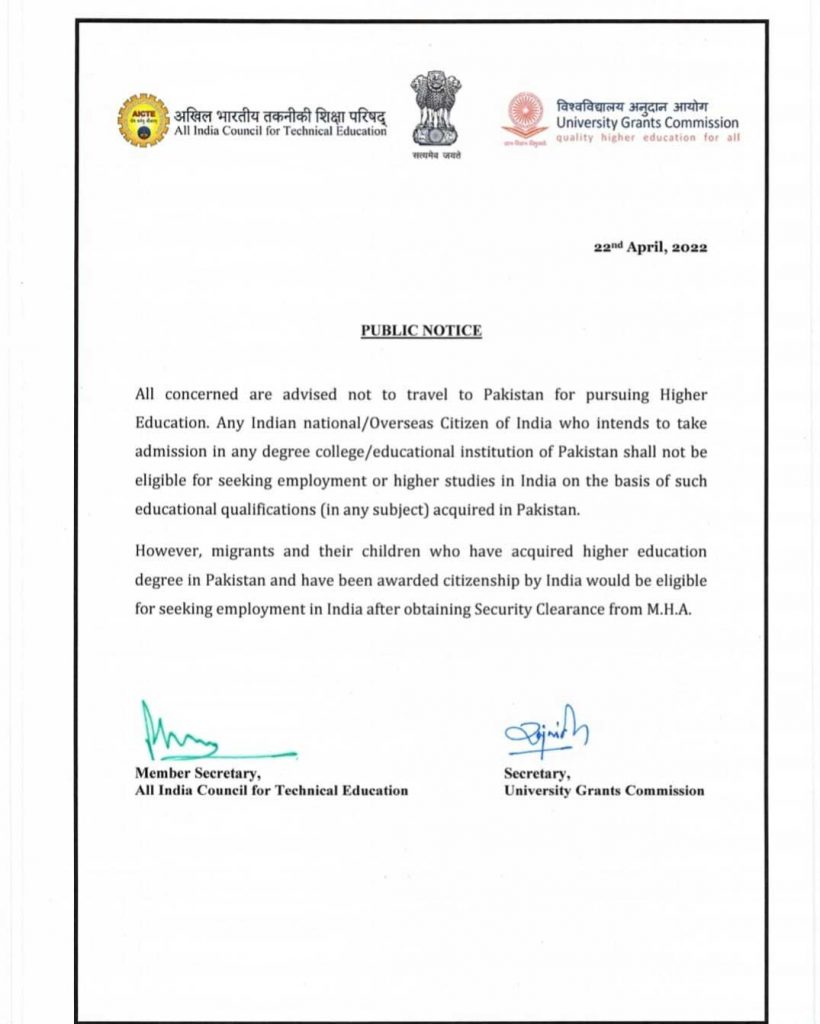 कोणताही भारतीय नागरिक किंवा भारतातील परदेशी नागरिक जो पाकिस्तानच्या कोणत्याही पदवी महाविद्यालयात प्रवेश घेऊ इच्छितो तो पाकिस्तानमध्ये प्राप्त केलेल्या शैक्षणिक पात्रतेच्या आधारावर भारतात नोकरी मिळविण्यासाठी पात्र नसतो, असे नोटीसमध्ये म्हटले आहे.